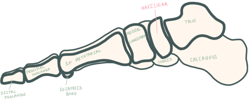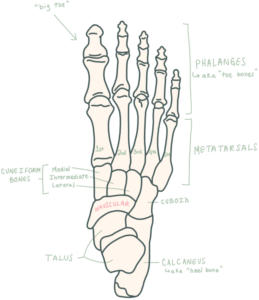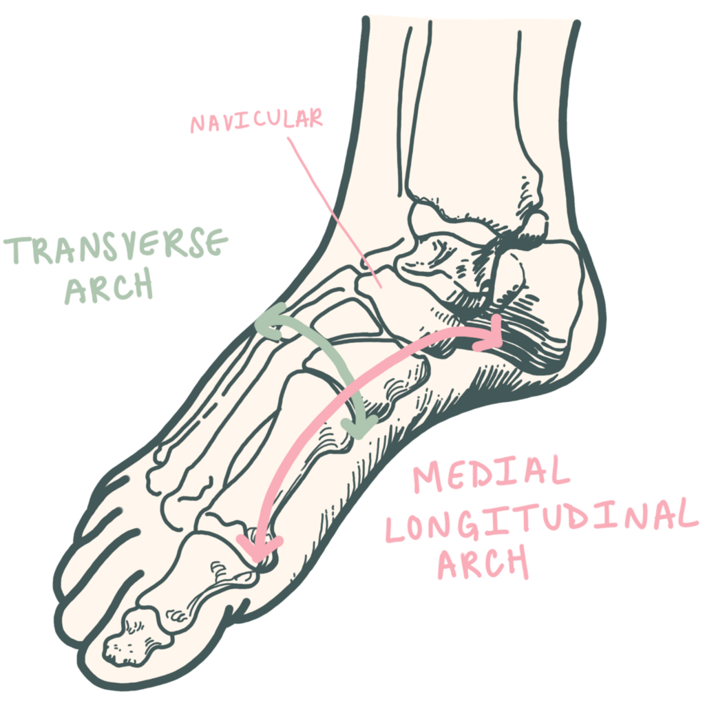 The foot has multiple arches: the primary ones are the transverse arch and the medial longitudinal arch (MLA); these provide stability and mobility5. The MLA is the arch we dancers are referring to when dishing out compliments – “your feet are AMAZING!” You’ll notice in my drawings that I’ve made especially sure to identify the navicular bone – this bone is a key player in determining the height of the MLA5. Without the navicular bone, the entire arch collapses. The surrounding bones, ligaments, and muscles assist in maintaining the structure of the MLA5 .