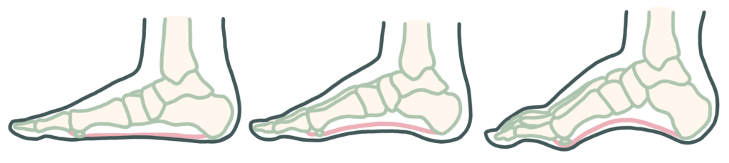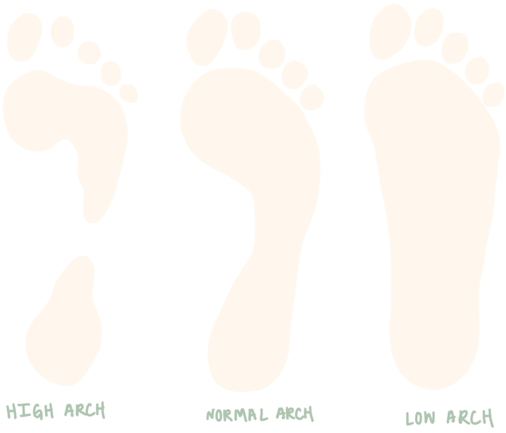 In dancers with highly arched feet, formally known as “pes cavus”, the MLA does not have the same springiness and elasticity. While aesthetically pleasing in dance, these feet are often described as being “rigid” and “non-shock absorbent”3. High arched feet also have a reduced contact area with the ground – peep those footprints below. As a result, these feet are more at risk of developing metatarsalgia (pain in the ball of the foot) and plantar fasciitis (pain from inflammation in the plantar fascia), a tightened Achilles tendon, and claw toes. This is because of the unequal distribution of weight through the feet caused by high arches3, 5. Overall, those with high arches are 60% more likely to experience a higher incidence of foot pain in comparison to those with normal arched feet3.