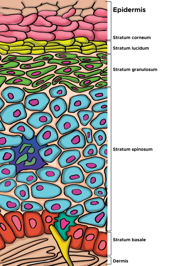 3. Yousef H, Alhajj M, Sharma S. Anatomy, Skin (Integument), Epidermis. [Updated 2022 Nov 14]. In: StatPearls [Internet]. Treasure Island (FL): StatPearls Publishing; 2023 Jan-. Available from: https://www.ncbi.nlm.nih.gov/books/NBK470464/